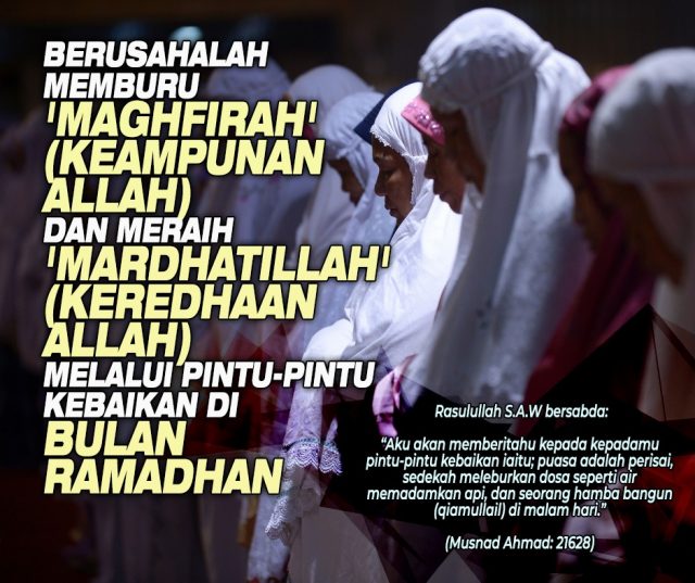 Di bulan Ramadhan ini Allah SWT menyediakan pintu-pintu kebaikan kepada orang-orang beriman supaya mereka menjadi insan yang bertakwa. Apabila orang beriman memasuki pintu kebaikan tersebut maka ia akan membuka pintu-pintu kebaikan lain pula. Di bulan yang mulia dan penuh barokah ini, Allah SWT sediakan tiga pintu kebaikan yang terbuka lebar untuk orang beriman mendapat keampunan dan keredhaan Allah SWT. Amat rugilah jika seorang Muslim tidak memanfaatkan pintu kebaikan yang tersedia di bulan yang mulia ini. Hidup di dunia ini adalah untuk ‘bekerja keras’ sebelum mendapat ‘rehat’ yang panjang di negeri akhirat sana. Pintu kebaikan yang Allah SWT sediakan di bulan Ramadhan ini adalah seperti pesan Rasulullah SAW kepada Muaz bin Jabal RA. Rasulullah SAW bersabda:
