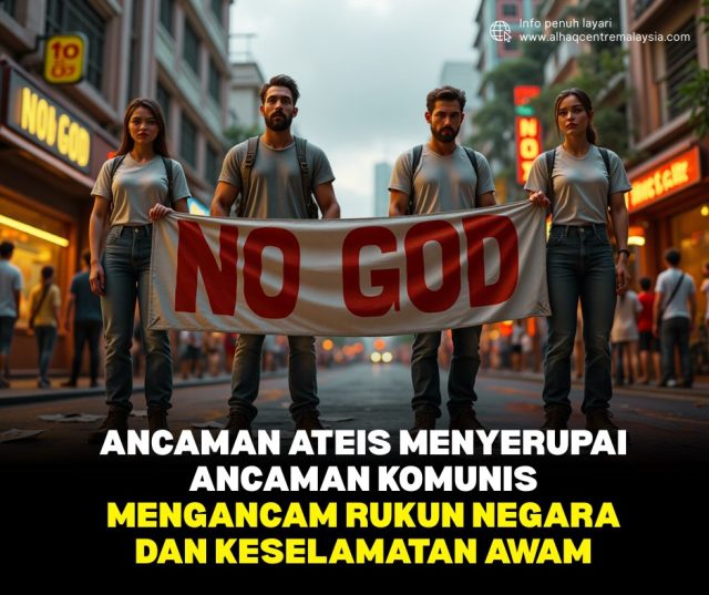 Ancaman ateis yang berideologi ‘godless’ tidak jauh bezanya dengan ancaman komunis yang mana kedua-duanya menolak kewujudan agama sekaligus menafikan kewujudan Allah SWT. Kedua-duanya juga bercanggah dengan Rukun Negara lantas Rukun Negara pertama dinafikan oleh kedua-dua fahaman ini.