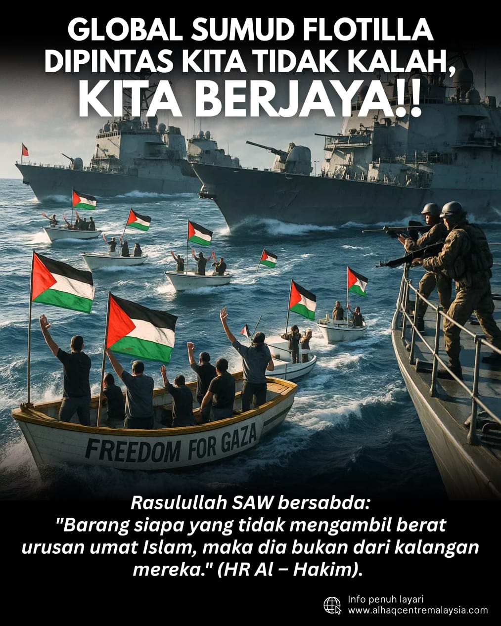 Namun ketahuilah, pemintasan ini bukanlah kekalahan. Ia adalah kemenangan moral dan rohani bagi seluruh umat manusia yang bermaruah. Mereka tidak takut dengan senjata, mereka bawa hati yang bersih dan tekad yang suci. Para sukarelawan GSF bukan membawa bendera perang, tetapi panji kasih sayang dan keprihatinan. Dalam Islam, membantu mereka yang tertindas adalah kewajipan yang dituntut syarak. Rasulullah SAW: