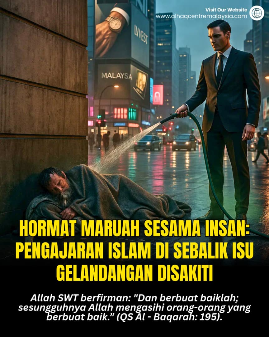 Baru-baru ini tular sebuah video yang memperlihatkan seorang pengawal keselamatan wanita menyembur air ke arah seorang gelandangan, diikuti tindakan seorang lelaki warga emas menendang gelandangan tersebut. Insiden ini telah mencetuskan kemarahan masyarakat kerana ia bukan sahaja menyinggung nilai kemanusiaan, malah bercanggah dengan prinsip akhlak Islam yang menekankan kasih sayang, ihsan dan penghormatan terhadap maruah setiap insan.