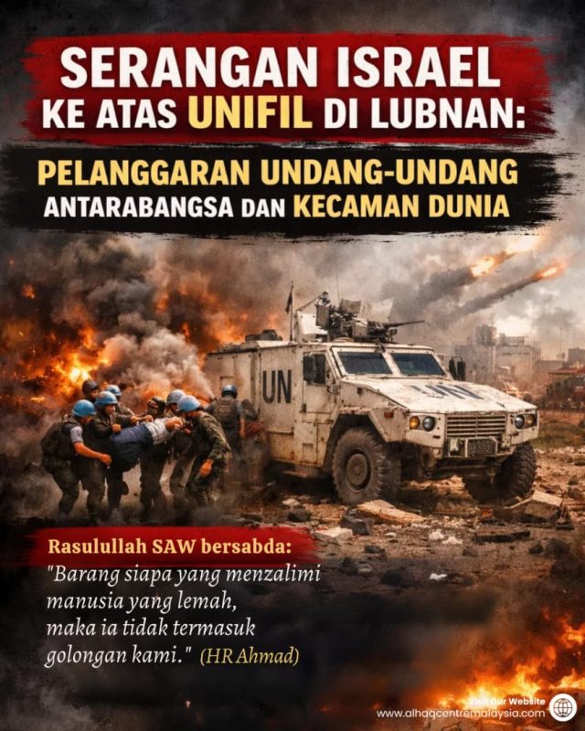 Serangan ke atas pasukan pengaman Pasukan Interim Pertubuhan Bangsa-Bangsa Bersatu (UNIFIL) di selatan Lubnan oleh Israel baru-baru ini telah mencetuskan kecaman antarabangsa, termasuk daripada Malaysia. Dalam serangan tersebut, tiga anggota pengaman Indonesia terkorban manakala yang lain mengalami kecederaan. Tindakan Zionis Israel ini jelas menunjukkan kezaliman dan ketidakpatuhan mereka terhadap undang-undang antarabangsa, sekaligus menjejaskan keamanan serantau yang sedang dibina. Allah SWT berfirman: