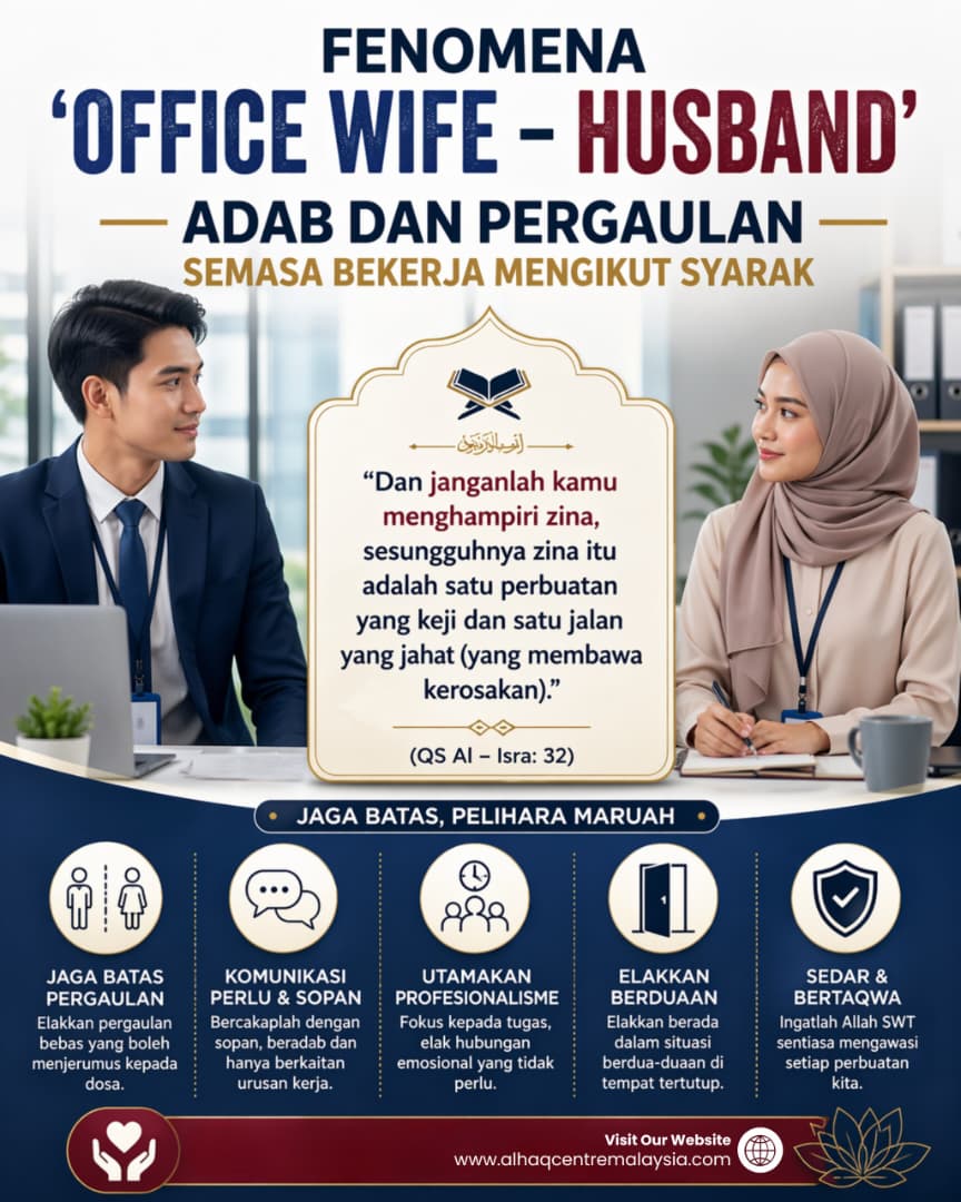 Mutakhir ini, fenomena “office husband” atau “office wife” semakin menjadi trend dalam kalangan masyarakat moden. Istilah ini merujuk kepada hubungan akrab antara rakan sekerja berlainan jantina yang berkongsi masalah peribadi, menjadi tempat mengadu dan meluangkan masa bersama seolah-olah pasangan suami isteri. Pada zahirnya, ia mungkin dilihat sebagai persahabatan biasa, namun hakikatnya hubungan ini boleh melangkaui batas yang dibenarkan dalam Islam.